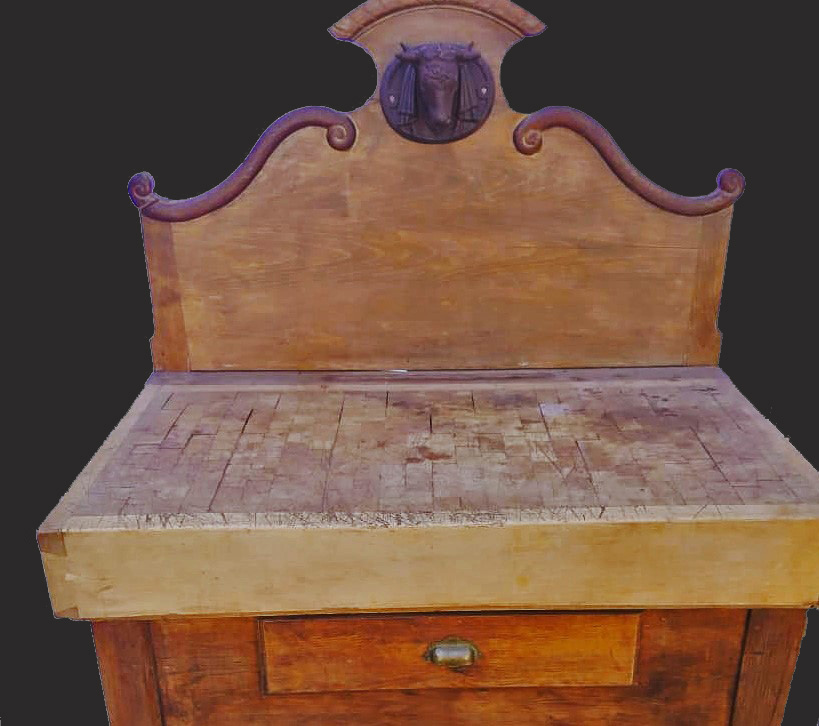 Een Frans slagersblok / hakblok was vroeger vaak versierd met een stierenkop.